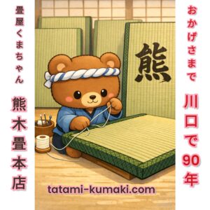 「畳屋くまちゃん」熊木畳本店のこだわり 取り扱っている畳表は 一般向け、賃貸向け、業者向け畳工事や畳商品全てに『日本国産畳表』を使用しております。 どうして、当店では日本国産畳表にこだわるのか・・・。 私、自身が輸入畳表の影響で、体調に異変を感じたために着色加工、樹脂加工を一切していない「安心できる畳表」を求めた結果が熊本県産イグサ畳表を使うことでした。